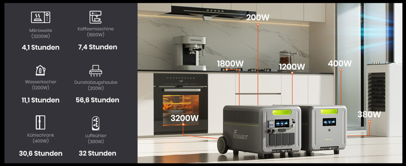 | 6× Fossibot SP420 | 2520W | ~2,4 Stunden |