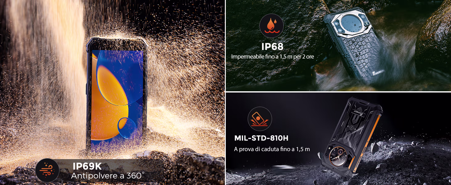 - 🛡️ Rugged autentico: Certificazioni IP68/IP69K e standard MIL-STD-810G contro acqua, polvere e urti.
